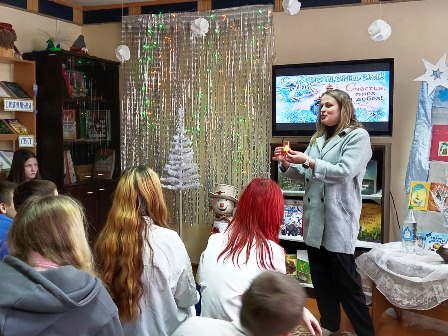 Библиотекарь рассказала ребятам о православном празднике Крещении, о святой воде и белом голубе. Рассказ сопровождался песней в исполнении хора «Ангелы в небе» и просмотром информационного видеоролика о Крещении Господнем.